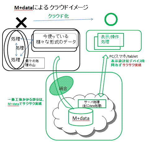 当社は、その解決のためミドルウェアM+dataを開発しました。クラウドサービスとしてインテグレータに提案すると共に、自社開発ソリューションのコアとしても活用します。